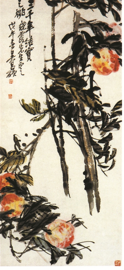 吳昌碩,原名俊,俊傾,字昌碩,別號缶廬、大龍、苦鐵等,浙江安吉人。“詩、書、畫、印”四絕的一代宗師,與任伯年、趙之謙、虛谷齊名為“清末海派四大家”?!度杲Y(jié)實之桃》,作于1918年。這幅作品運用篆書筆法,疏闊縱放,雄渾有力,顯現(xiàn)出磅礴而茁壯的氣勢,筆力強悍,是吳昌碩大器晚成的絕佳寫照。