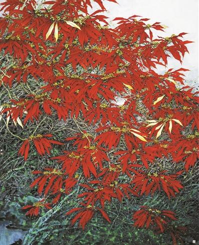 據(jù)閆國星介紹,這幅作品是他的老師給他布置的“命題作文”,為了完成作品,他特地坐飛機去西雙版納觀察野生一品紅,并在那里住了一個月,專門畫這個題材。因為題材新穎,傳統(tǒng)的筆墨無法表達其神韻,因此在畫法上,閆國星進行了大膽創(chuàng)新,在傳統(tǒng)畫法中融入現(xiàn)代畫法,最終這幅佳作才得以問世。