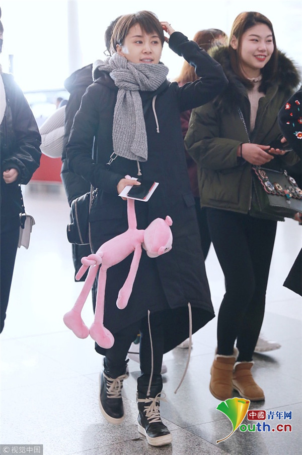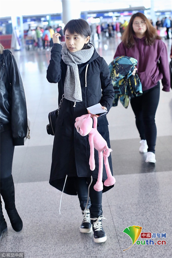 2017年12月10日,北京,王子文現(xiàn)身機(jī)場,裹圍巾羞澀撓頭,少女感十足,提溜粉絲所贈“粉紅豹”童心未泯。