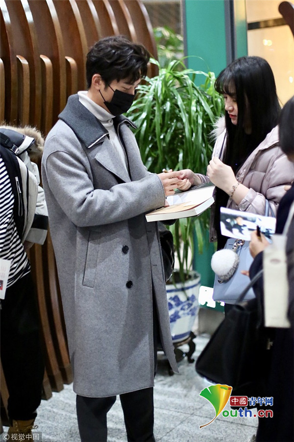 ??2017年12月13日,北京,竇驍身著灰色大衣、戴口罩現(xiàn)身機(jī)場(chǎng),為粉絲大方簽名,見(jiàn)鏡頭開(kāi)心比V揮手親和力滿分。