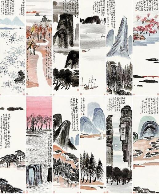 《山水十二條屏》每條屏形制整齊劃一,均為縱180厘米,橫47厘米,內(nèi)容包括:《江上人家》《石巖雙影》《板橋孤帆》《柏樹森森》《遠岸余霞》《松樹白屋》《杏花草堂》《煙深帆影》《杉樹樓臺》《山中春雨》《板塘荷香》《紅樹白泉》。當把它們置于一處,便可以完整地呈現(xiàn)出齊白石筆下的美好家園情景——長天落日、桂林山水、浮萍山影、小橋流水,濃郁的東方家園情愫撲面而來。據(jù)悉,存世的《山水十二條屏》僅有兩套,另一套現(xiàn)收藏在重慶博物館。