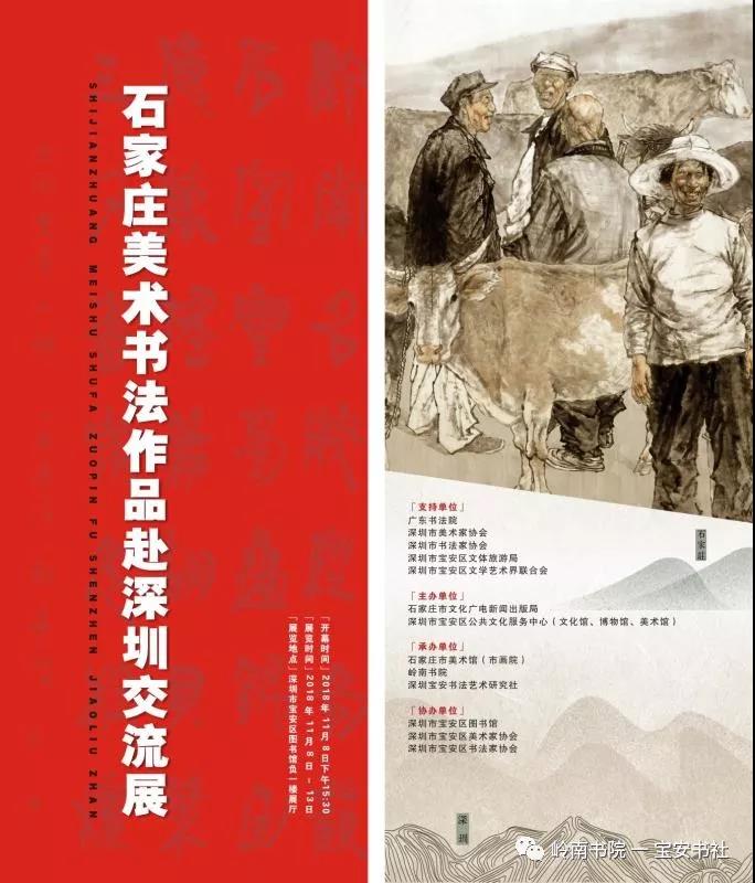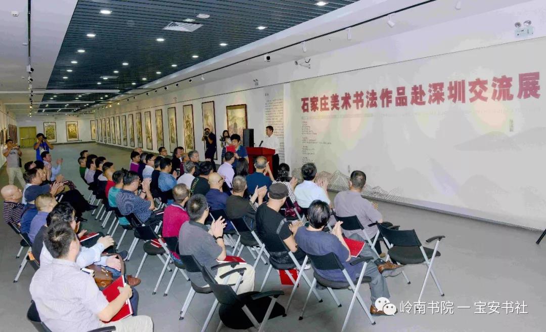 2018年11月8日下午15:00,由石家莊市文化廣電新聞出版局、深圳市寶安區(qū)公共文化服務(wù)中心(文化館、博物館、美術(shù)館)主辦,石家莊市美術(shù)館(市畫院)、嶺南書院、深圳寶安書法藝術(shù)研究社承辦,深圳市寶安區(qū)圖書館、寶安區(qū)美協(xié)、寶安區(qū)書協(xié)協(xié)辦并得到深圳市書法家協(xié)會、美術(shù)家協(xié)會、寶安區(qū)文體旅游局、寶安區(qū)文聯(lián)的大力支的 “ 石家莊美術(shù)書法作品赴深圳交流展 ” 在深圳市寶安區(qū)圖書館負(fù)一樓展廳隆重開幕——
