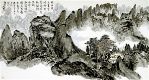 王和平不僅能書寫2尺的大字,還能寫篆書、隸書、行書、草書、楷書,他尤其擅長以指書寫長線條幅,還能書寫小到1寸左右的楷書、行書、草書等各種書體?!皬乃摹饵S山系列》,我看到了一個(gè)堅(jiān)強(qiáng)的古典腳步,追尋在范寬的《谿山行旅途》中,沐李唐的《萬壑松風(fēng)圖》,聽馬遠(yuǎn)的《踏歌圖》……一個(gè)精美絕倫的藝術(shù)時(shí)代遠(yuǎn)逝而去,念天地之悠悠,獨(dú)愴然而涕下。留幽幽懷古者,追憶圣賢高士清歌古琴于卷軸中的絕美風(fēng)騷。王和平和我都是這個(gè)幽幽懷古者,追求高貴古典精神的尋賢之人?!边@是評(píng)論家豐川在他的《心有千像,十指墨弦》一文中評(píng)價(jià)王和平的指書所述。