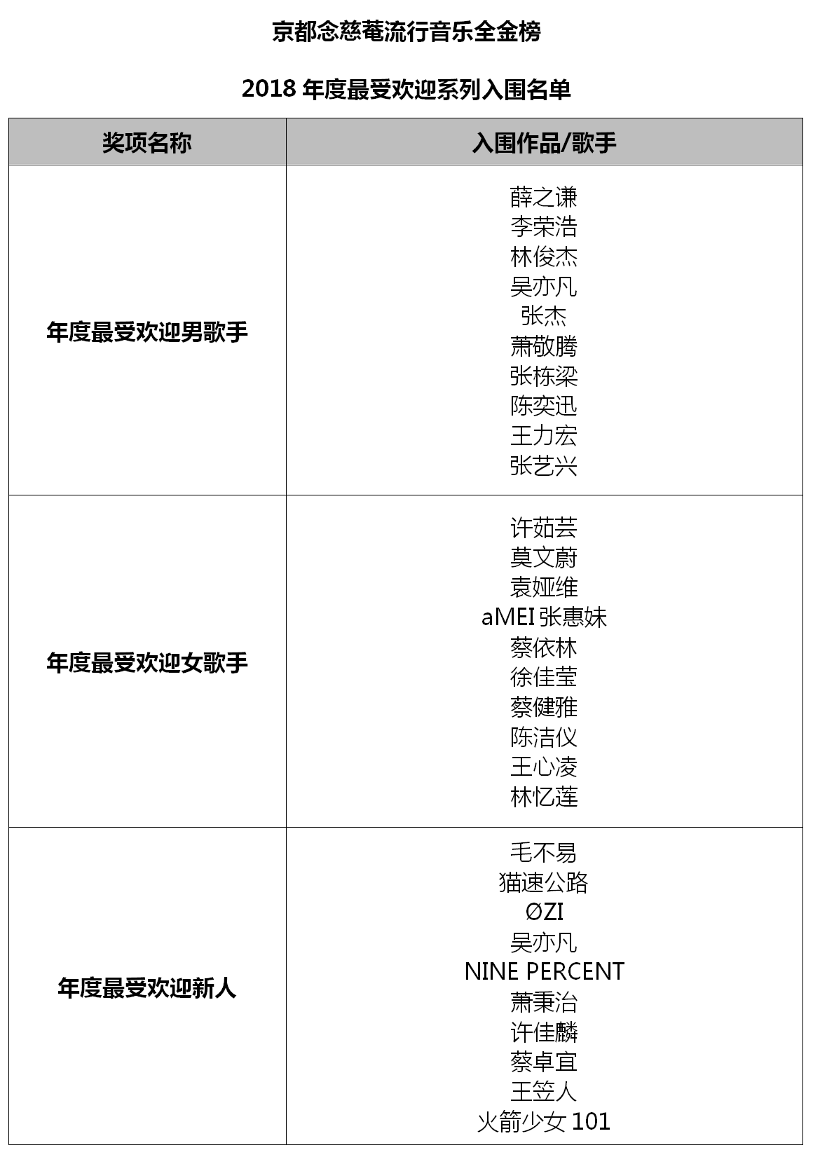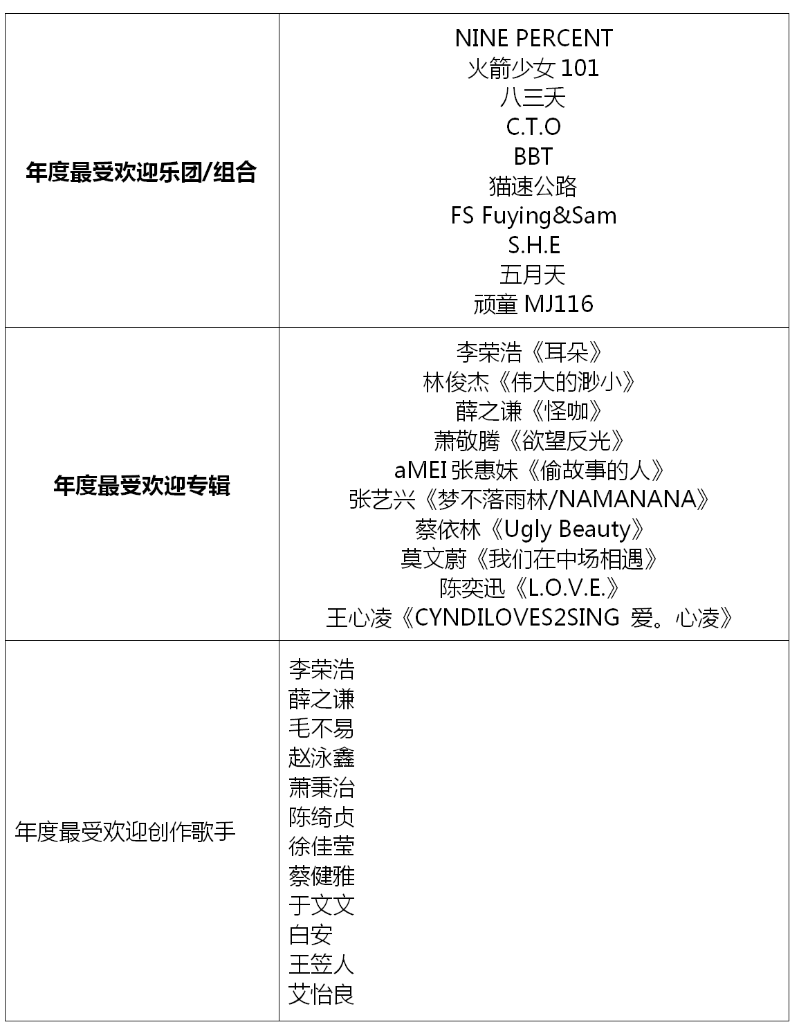 “年度最受歡迎樂(lè)隊(duì)/組合”入圍名單中,同在2018年成功舉辦巡回演唱會(huì)的五月天、S.H.E等老牌組合的進(jìn)榜,讓大家看到了華語(yǔ)樂(lè)壇常青樹(shù)的非凡音樂(lè)實(shí)力;八三夭、C.T.O、BBT、FS Fuying&Sam、頑童MJ116等組合,憑借不減反升的人氣魅力實(shí)力進(jìn)榜;而NINE PERCENT、火箭少女101及貓速公路等新人組合的二次入圍,不僅僅是對(duì)他們?cè)谝魳?lè)成績(jī)上的肯定,更是對(duì)其未來(lái)之路的鼓勵(lì)。