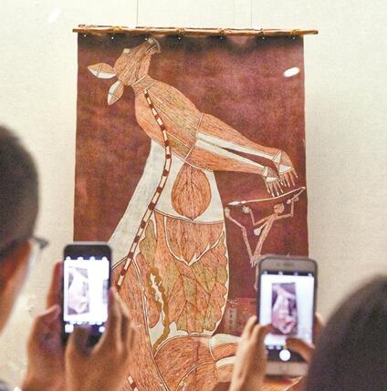 樹皮畫是人類一項(xiàng)古老的藝術(shù),也是澳大利亞原住民延續(xù)保留至今的一種藝術(shù)形式。澳大利亞的樹皮畫承載了深厚的文化和思想內(nèi)涵,被稱為是“活著的”原始繪畫。本次展覽展示了位于澳大利亞北海岸線的阿納姆地原住民藝術(shù)家創(chuàng)作的120余件樹皮繪畫,以及繪制工具、木雕木刻等,反映了澳大利亞原住民對(duì)世界的理解和認(rèn)識(shí),以及他們的生活習(xí)俗、精神世界與文化傳統(tǒng),也展現(xiàn)了澳大利亞原始藝術(shù)的鮮明特色。