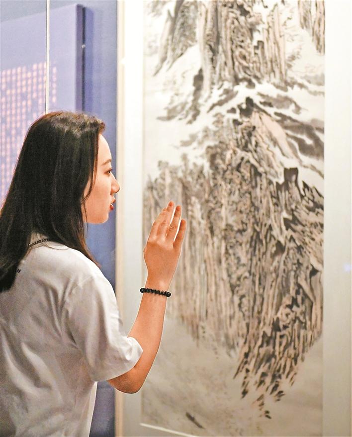 展覽一經(jīng)推出,就迅速吸引了絡繹不絕的市民前來參觀。面對暑期人流量大的情況,關館特地推出了豐富多樣的公共教育服務。不僅有志愿者導覽,還有親子工作坊、數(shù)字化設計等等,內容接地氣,趣味橫生。記者看到不少孩子都在家長的指引下拿著畫本在美術館里臨摹、學習,通過這種方式與國畫家們一起交流切磋。