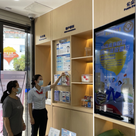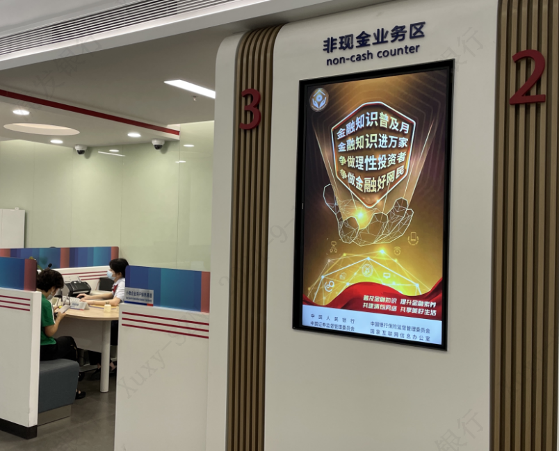 在網(wǎng)點(diǎn)營業(yè)大廳內(nèi),電子屏中的2021年金融知識普及月海報(bào)營造了良好宣傳氛圍。金融之手,強(qiáng)而有力,各營業(yè)網(wǎng)點(diǎn)一手承接了金融知識普及多方面的內(nèi)容,共同構(gòu)建了線上線下、電信、網(wǎng)絡(luò)等多渠道傳播的金融知識普及傳播網(wǎng),有力推進(jìn),勢在必行。