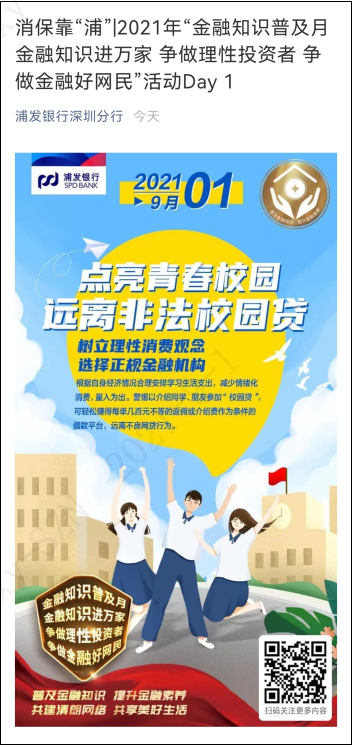 9月1日,也是校園開學(xué)的日子。開學(xué)的第一天,浦發(fā)銀行深圳分行特別推出“點(diǎn)亮青春校園遠(yuǎn)離非法校園貸”日歷宣傳海報(bào),并在官方微信公眾號進(jìn)行轉(zhuǎn)發(fā)宣傳,同時在46家網(wǎng)點(diǎn)營業(yè)大廳顯示屏播放,重點(diǎn)傳播校園貸金融知識,提醒學(xué)生人群,合理消費(fèi),遠(yuǎn)離不良網(wǎng)貸行為。據(jù)悉,該行將在九月每個工作日持續(xù)發(fā)布消保宣傳日歷,常態(tài)化長效推進(jìn)金融知識普及月宣傳活動的開展。
