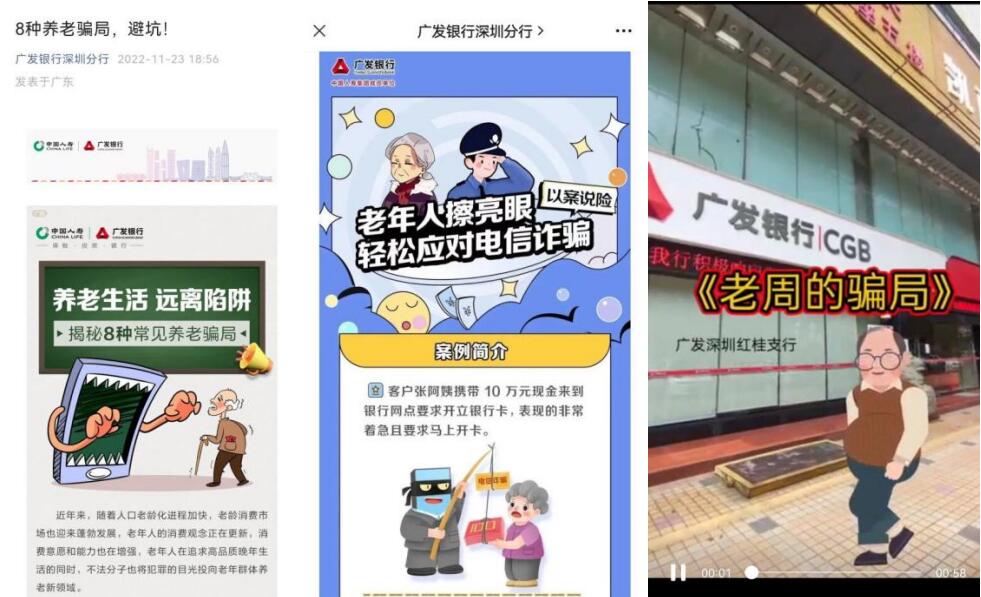 廣發(fā)銀行深圳分行積極運用數(shù)字科技與新媒體宣傳相結(jié)合,通過發(fā)動全行開展寓教于樂的短視頻大賽方式來宣傳金融知識,提高老年人防范養(yǎng)老詐騙意識;通過分行微信公眾號發(fā)送防范非法集資、防范養(yǎng)老詐騙等宣傳軟文;加強對打著科技創(chuàng)新、綠色轉(zhuǎn)型等政策旗號,利用元宇宙、NFT等新概念的新業(yè)態(tài)新形態(tài)等非法集資活動進行風(fēng)險提示。