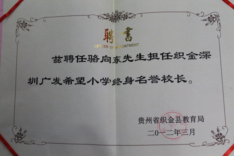 2013年,在駱向東的退休儀式上,織金縣教育局將一張希望小學(xué)終身名譽校長的聘書,鄭重交到了他的手上?!拔液軜s幸能代表廣發(fā)銀行深圳分行黨委去推動這件事,但公益事業(yè)任重道遠(yuǎn),我相信愛心基因會在廣發(fā)一直傳承下去?!笔聦嵰舱珩樝驏|所言,從1998年籌建希望小學(xué)至今,一代代廣發(fā)人身體力行,讓愛心助學(xué)一棒接力一棒。