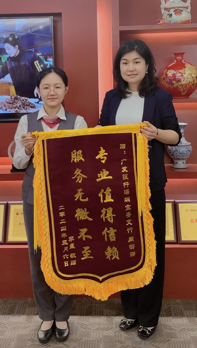 深圳新聞網(wǎng)2024年5月11日訊(記者 朱琳)“真的太感謝廣發(fā)銀行了!要不是廣發(fā)銀行專業(yè)高效的服務(wù),我這筆貨款都不知何時(shí)能付出去!”小微企業(yè)主李先生握著廣發(fā)銀行深圳寶安支行服務(wù)經(jīng)理周柳珊的手激動(dòng)地說(shuō),隨后將一面印有“服務(wù)無(wú)微不至,專業(yè)值得信賴”的錦旗送到她的手中,向該行熱情、高效、暖心的服務(wù)表示感謝。錦旗上十二個(gè)金燦燦的大字寄托了客戶對(duì)廣發(fā)銀行沉甸甸的信任和堅(jiān)定不移的支持。