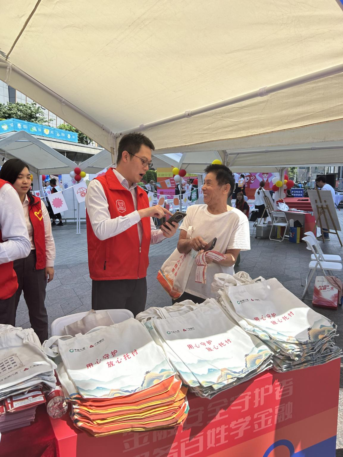 廣發(fā)銀行深圳分行紀(jì)委書記杜經(jīng)濤向現(xiàn)場(chǎng)群眾發(fā)放宣傳購物袋