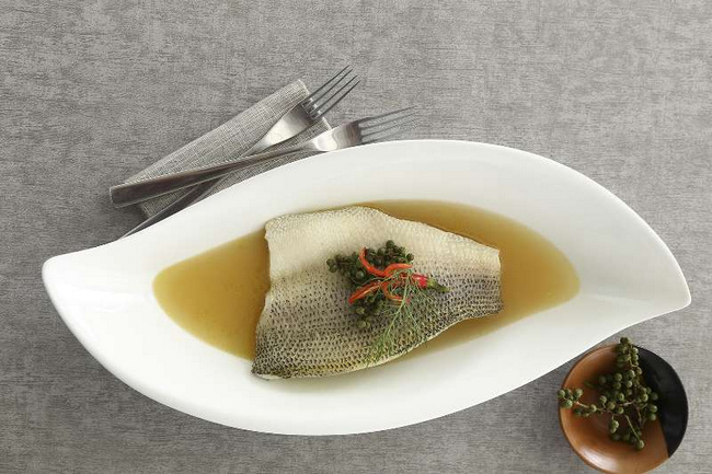 區(qū)別于充斥著辣椒與熱油的傳統(tǒng)水煮魚,梧桐 PLUS 的 fusion水煮魚外表清新,口感麻辣。食材選用三斤左右的上等淡水鱸魚,清晨宰殺,剔骨后整場取肉,再經(jīng)過高溫蒸制,保證魚肉肉質(zhì)嫩滑松軟。并不像傳統(tǒng)的水煮魚采用的“湯菜”的方式,fusion水煮魚采用肉料分離的烹飪方式。魚湯經(jīng)過麻椒、辣椒的熬煮而變得味道濃郁,過濾后僅留清爽的湯汁,單從視覺上根本無法判斷蘊藏的奇妙味道,這也正是這道招牌菜的精妙之處。盛盤后的fusion 水煮魚猶如一道藝術(shù)品,造型簡約充滿意境,清亮的魚湯入口瞬間酸辣感通透口腔,脫離了紅油浸泡的濃郁麻辣口感,更加健康養(yǎng)生。