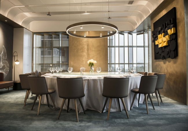 以黑色和金色為主色調(diào)的梧桐PLUS,選用流動的線條對餐廳空間進行分割。桌與桌之間的距離保證了食客對話的私密性和安全性。即使沒有預(yù)定到包廂,也不用擔心旁邊食客的閑聊會影響到彼此。
