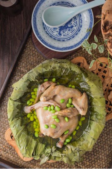 “池塘十里盡荷塘,姊妹朝來采摘忙,不摘荷花摘荷葉,飯包荷葉比花香?!鼻迥┟癯醯倪@首詞,表明了人們對用荷葉制肴的喜好。選用肉質(zhì)細(xì)嫩的仔雞,以荷葉包裹蒸熟,松軟適口,呈現(xiàn)原汁原味的鮮美,融合荷葉的幽幽清香,細(xì)細(xì)品味,仿佛回到夢里水鄉(xiāng)。