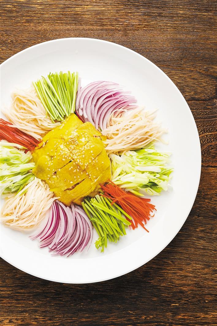 “撈”在粵語中有工作有錢賺的意思,祝愿來年風(fēng)生水起。徐師傅采用遠(yuǎn)近馳名的葵花雞??u顧名思義,由新鮮的葵花盤、葉、桿等炮制而成的飼料喂養(yǎng),以葵花桿榨成的汁解渴,是十足的“雞中貴族”。徐師傅選用講究的雞肉來準(zhǔn)備這道講究的菜,寓意前來用餐的賓客在來年可以步步高升、事事順利。將葵花雞、子姜絲、洋蔥絲、香菜段等各式新鮮食材撈到一起,齊齊起筷,高呼:“齊齊撈起,撈到風(fēng)生水起!”