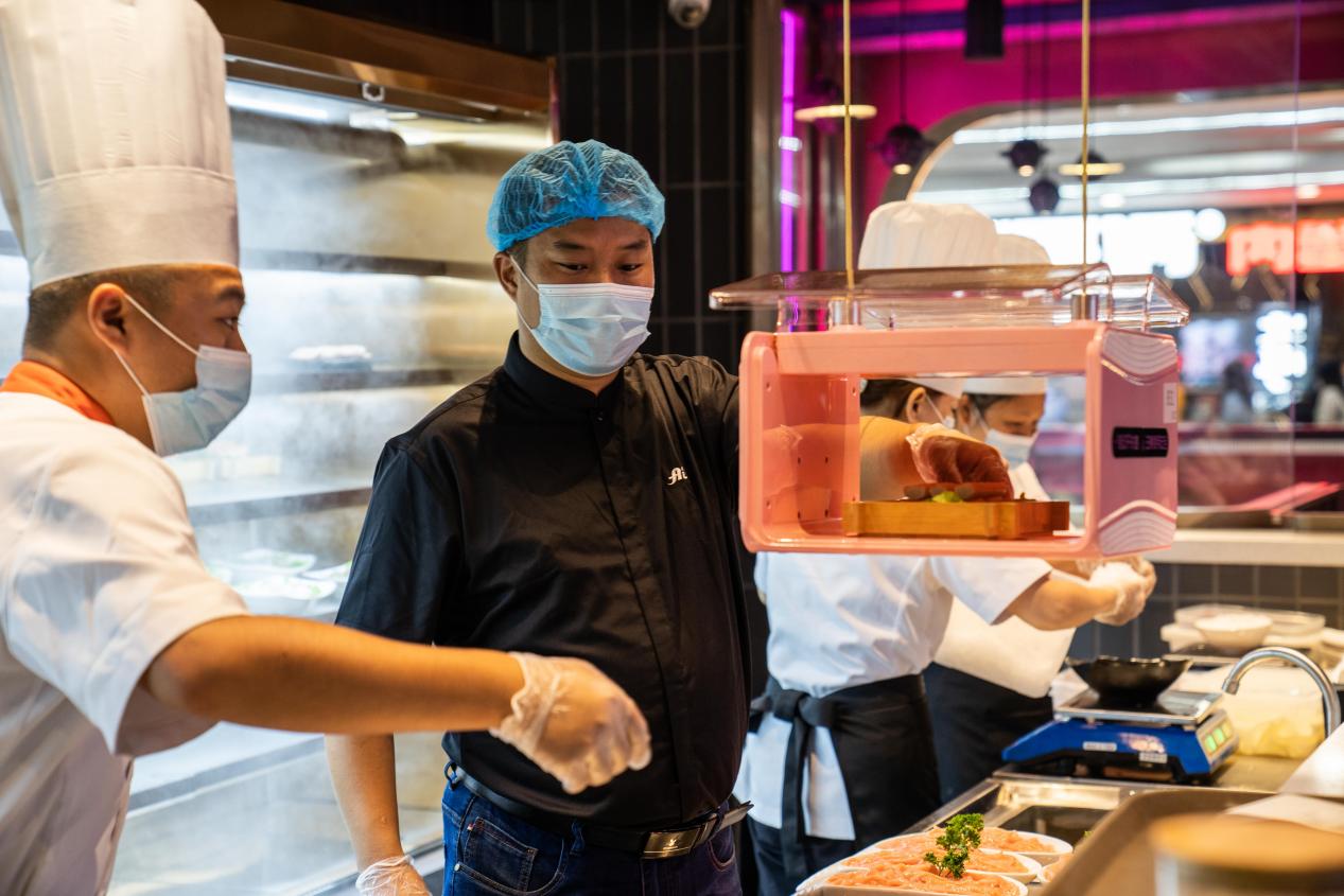 值得一提的是,除了地道的火鍋美食,這家餐廳的特別之處,在于高科技智能機器人的廣泛應用。在餐廳過道里,一款名為“蠶豆”的配送機器人來回奔忙,把各式菜品有條不紊地送達顧客桌前。半空中,高效穿梭的云軌小車將菜品傳送到餐桌,“從天而降”呈現(xiàn)在顧客面前,科技體驗感十足。這款“天降”智能云軌傳輸系統(tǒng),由智能配餐、智能云軌兩大模塊構成。顧客通過手機下單后,智能配餐系統(tǒng)接到指令,能自動將相應菜品餐食分配給云軌小車,高效、快速地配送到對應餐桌,整個送餐過程實現(xiàn)“零接觸”,在高效率的同時,確保了安全衛(wèi)生。