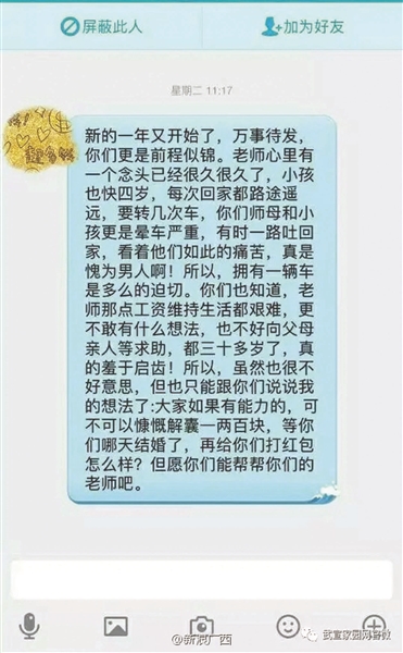 爆料帖中同時(shí)上傳了多張聊天記錄,其中一張顯示:“新的一年又開始了,萬事待發(fā),你們更是前程似錦。老師心里有個(gè)念頭已經(jīng)很久了,小孩也快四歲了,每次回家都路途遙遠(yuǎn),要轉(zhuǎn)幾次車,你們師母和小孩更是暈車嚴(yán)重,有時(shí)一路吐回家,看看他們?nèi)绱送纯?,真是愧為男人??!所以,擁有一輛車是多么的迫切。你們也知道老師那些工資維持生活都很艱難,更不敢有什么想法,也不好向父母親人求助,都三十多歲了,真的羞于啟齒!所以,雖然也很不好意思,但是也只能跟你們說說我的想法了:大家如果有能力的,可不可以慷慨解囊一兩百塊,等你們哪天結(jié)婚了,再給你們打紅包怎么樣?但愿你們能幫幫你們的老師吧。”