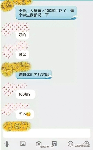 在被曝光的聊天記錄中,該老師曾表示,“大概每人100就可以了,每個(gè)學(xué)生我都說一下。”并解釋說,“誰叫你們老師窮呢?”聊天記錄顯示,群內(nèi)多名學(xué)生回復(fù)稱,“可以?!?/p>