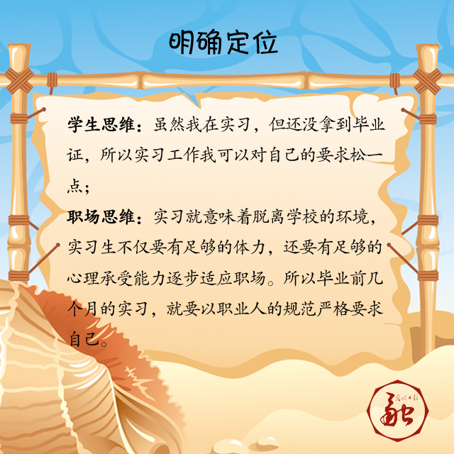 職場思維:實習(xí)就意味著脫離學(xué)校的環(huán)境,實習(xí)生不僅要有足夠的體力,還要有足夠的心理承受能力逐步適應(yīng)職場。畢業(yè)前幾個月的實習(xí),就要以職業(yè)人的規(guī)范嚴格要求自己。