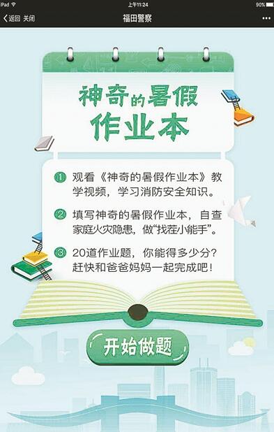 據(jù)介紹,完成這個(gè)作業(yè)并不難,只需分三步,第一步是關(guān)注微信公眾號(hào)“福田警察”觀看視頻,第二步是掃描二維碼直達(dá)《神奇的暑假作業(yè)本》,第三步是在家長(zhǎng)陪同下認(rèn)真完成家庭火災(zāi)隱患排查。當(dāng)然,最重要的是填寫信息欄,將火災(zāi)隱患反饋到后臺(tái)。“作業(yè)本”打開后,各種常見的消防隱患會(huì)一一展現(xiàn)在眼前。說是作業(yè),它其實(shí)更像一個(gè)假期實(shí)踐,通過生動(dòng)的視頻和有針對(duì)性的問答,取代過去紙質(zhì)版消防安全宣傳冊(cè)的作用。