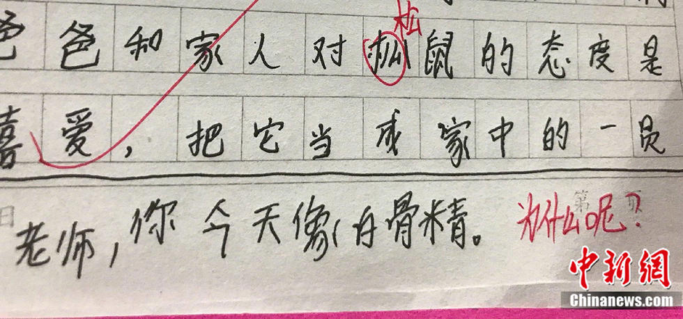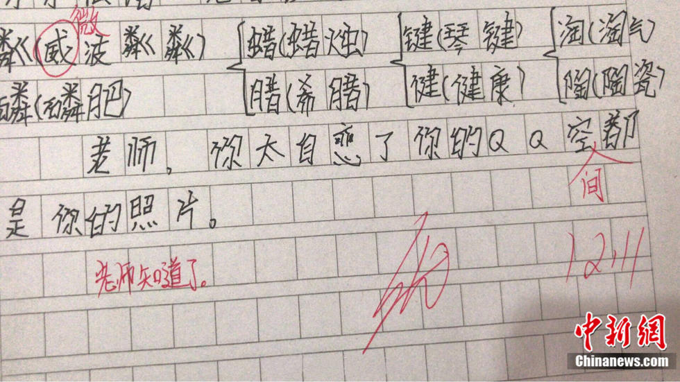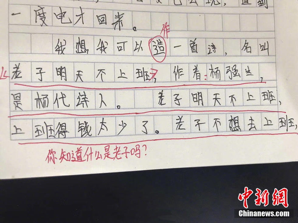 近日,貴州省谷隴翁板小學(xué)的語(yǔ)文老師張沁文,曬出了學(xué)生寫(xiě)在作業(yè)里的“金句”?!袄蠋煟闾詰倭?,QQ空間都是自己照片”;“顏值升高才有人喜歡您”……孩子們的童言無(wú)忌令人哭笑不得,老師的評(píng)論也很亮眼。