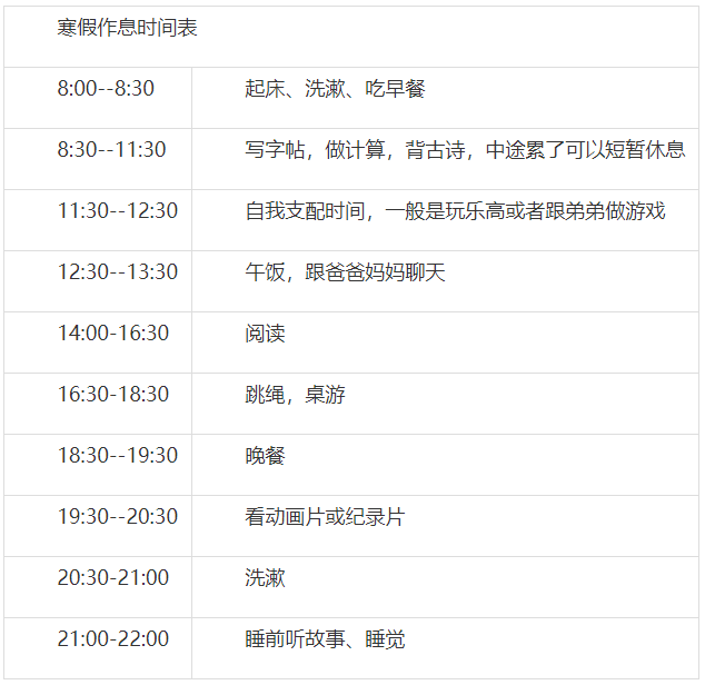為了不大眼瞪小眼,我和孩子一起制定了一張計劃表如下: