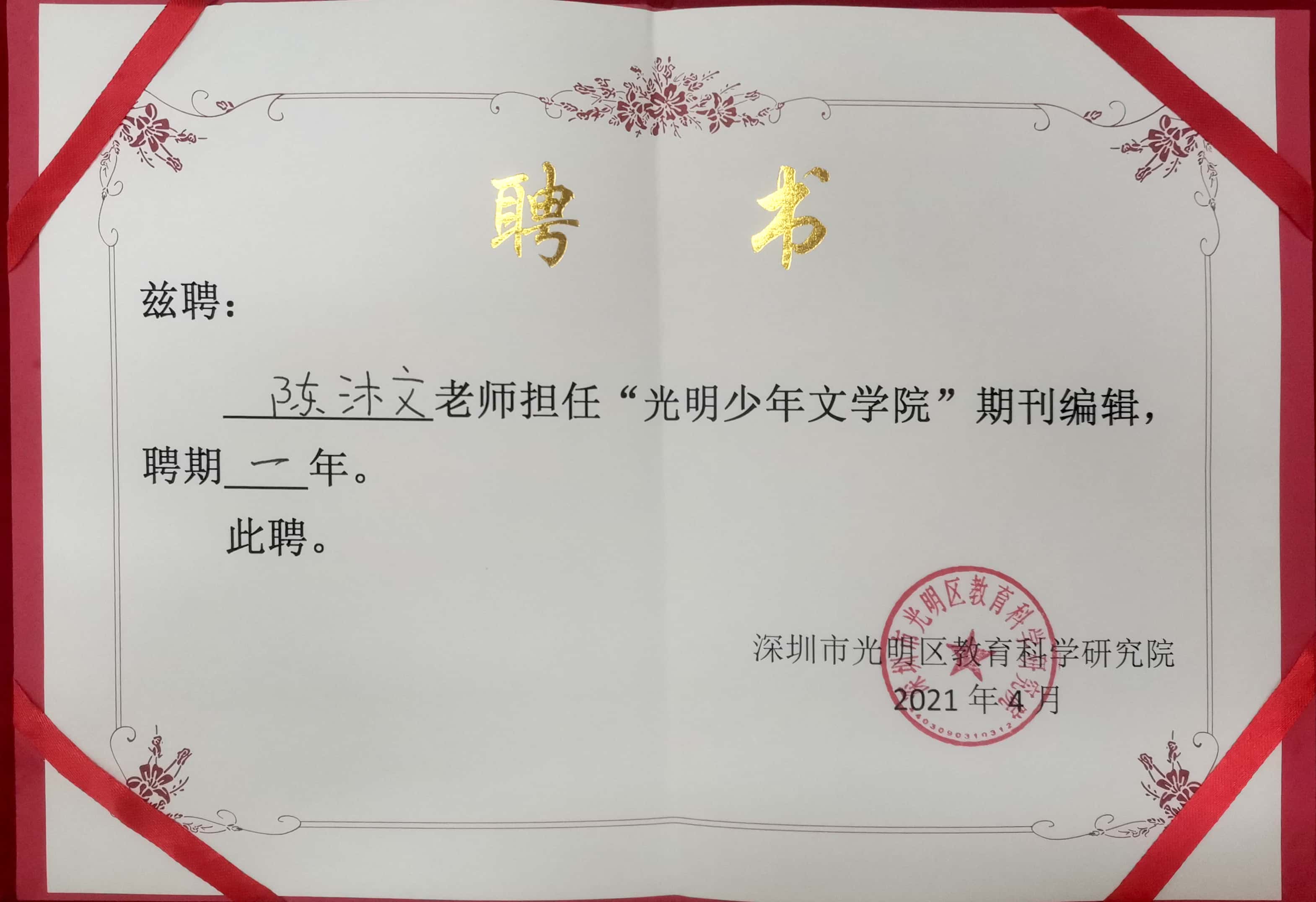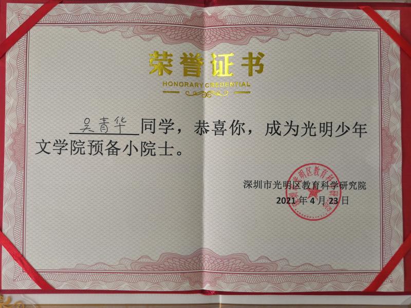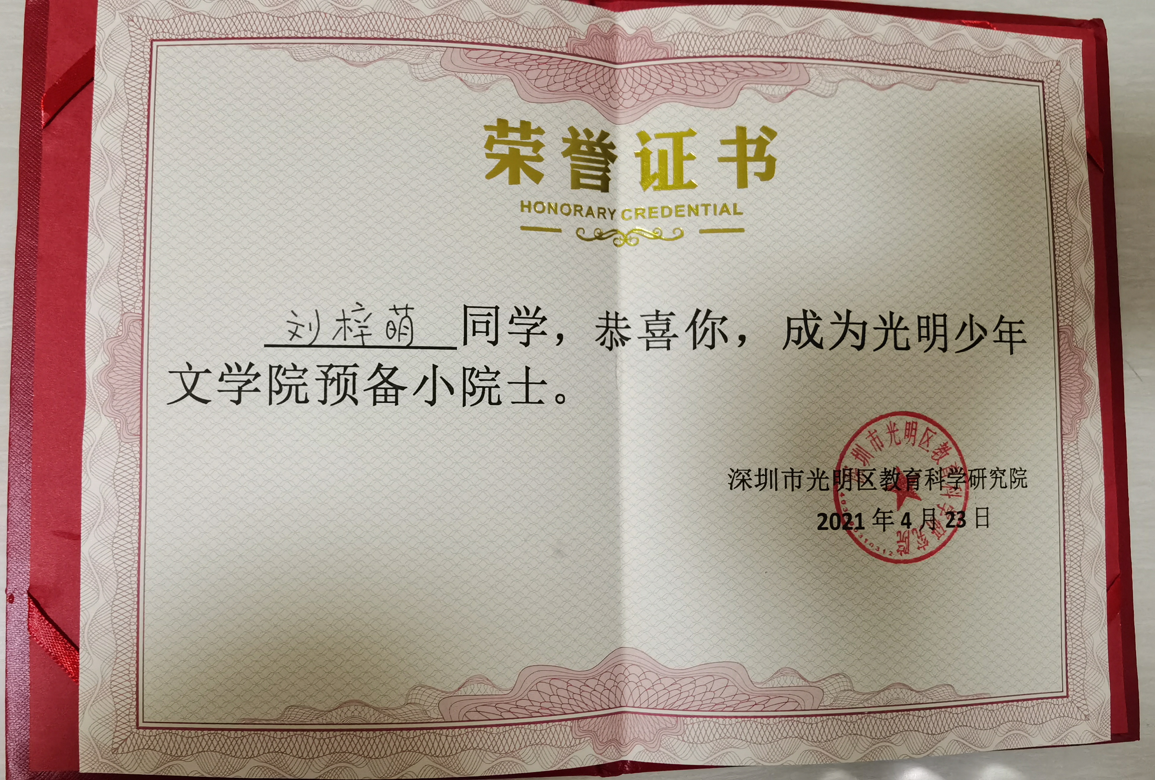 在光明區(qū)少年文學(xué)院評(píng)選中,學(xué)校獲批成立“光明區(qū)少年文學(xué)院分院”,陳沐文老師擔(dān)任文學(xué)院期刊編輯,方汶琪、劉梓萌、吳青華三位同學(xué)被授予“預(yù)備小院士”稱號(hào)。