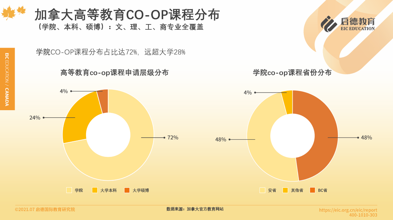 加拿大官方教育網(wǎng)站數(shù)據(jù)顯示,加拿大高等教育普遍開(kāi)設(shè)覆蓋文、工、理、商全專(zhuān)業(yè)的 Co-op帶薪實(shí)習(xí)課程,其中學(xué)院的 Co-op課程占比最多(72% ),其次是大學(xué)本科(24% )與大學(xué)碩博(4% )。在學(xué)院 Co-op課程的省份分布上,安大略省與英屬哥倫比亞省平分秋色,各占48%。