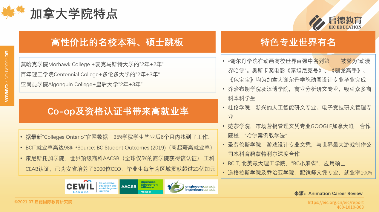 “ Colleges Ontario”官網(wǎng)數(shù)據(jù)顯示,85 %的學(xué)院學(xué)生畢業(yè)后6個(gè)月內(nèi)找到了工作,91%的雇主對(duì)學(xué)生表示非常滿(mǎn)意。如康尼斯托加學(xué)院,擁有世界頂級(jí)商科 AACSB與工科 CEAB認(rèn)證,為安省培養(yǎng)了5000位 CEO,畢業(yè)生每年為區(qū)域貢獻(xiàn)超過(guò)23億加元。而奧斯卡獎(jiǎng)電影《泰坦尼克號(hào)》、《馴龍高手》、《包寶寶》均為加拿大謝爾丹學(xué)院動(dòng)畫(huà)設(shè)計(jì)專(zhuān)業(yè)畢業(yè)完成。杜倫學(xué)院的人工智能專(zhuān)業(yè),道格拉斯學(xué)院的配鏡師專(zhuān)業(yè)也是世界有名的特色專(zhuān)業(yè)。