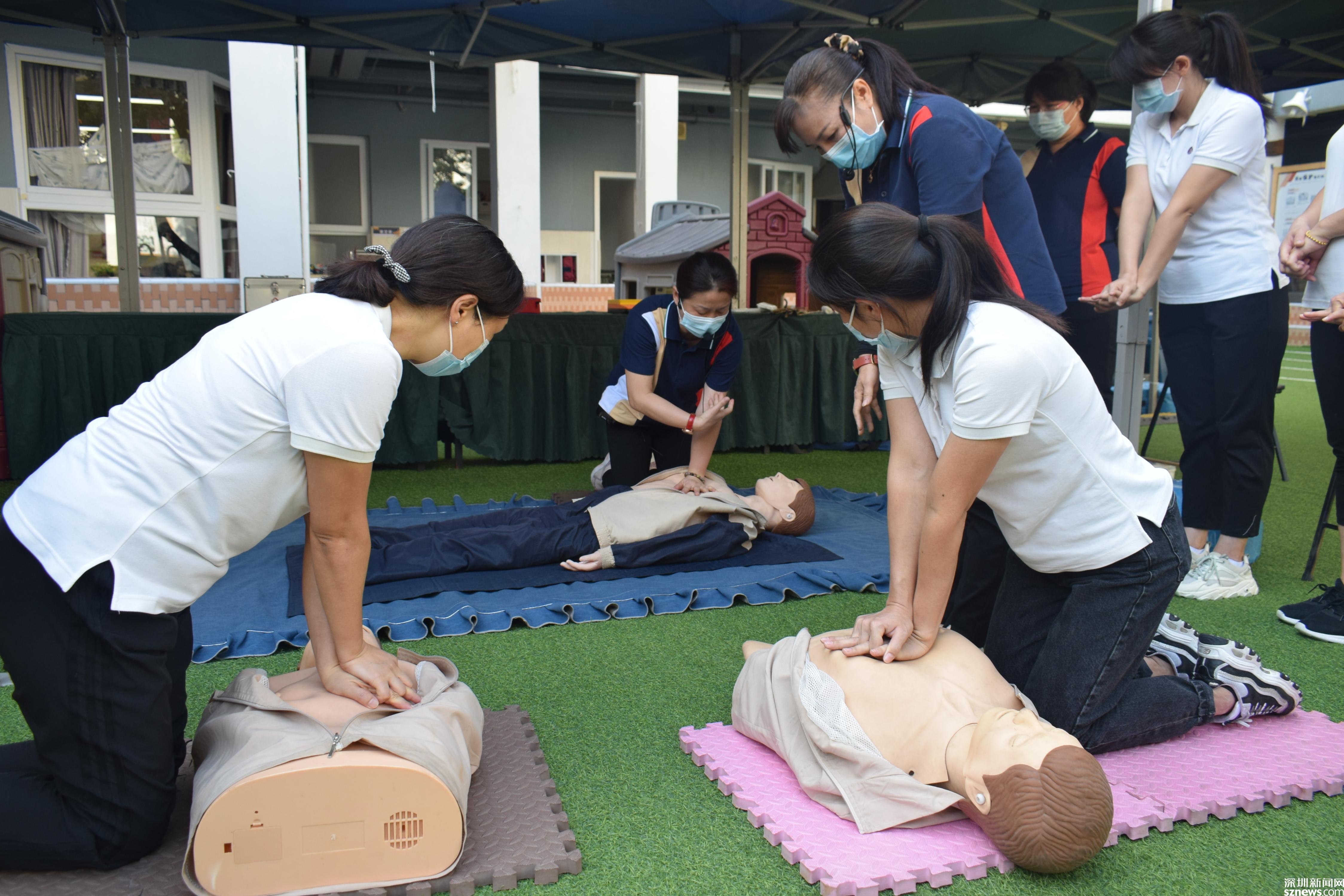 大鏟社區(qū)還組織全園教職工進行心肺復蘇訓練和骨折包扎訓練。教職工們在安全老師一對一指導與糾正下,反復訓練,基本掌握了心肺復蘇和骨折包扎步驟及動作要點。