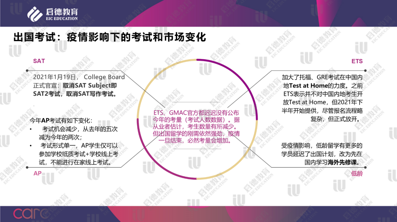 與此同時,國產(chǎn)疫苗被海外多國認(rèn)可。此外,各種跡象表明,作為最主要的留學(xué)語言,2021年英語考試認(rèn)證已放寬,考點也在增多。除了日本37所知名院校開展全英文授課外,韓國也可用英語成績遞交申請,法國提供1700個左右的英文授課課程,荷蘭碩士英語授課覆蓋率為95%,英語普及率在全世界非英語母語國家中最高。2021年1月19日,College Board正式宣布取消SAT Subject即SAT2考試,取消SAT寫作考試。2021年下半年 ETS對中國內(nèi)地考生開放Test at Home。同年,BC也在加快在中國內(nèi)地的雅思機(jī)考考點建設(shè)速度,計劃2022年將雅思機(jī)考考點覆蓋內(nèi)地四十多個城市。