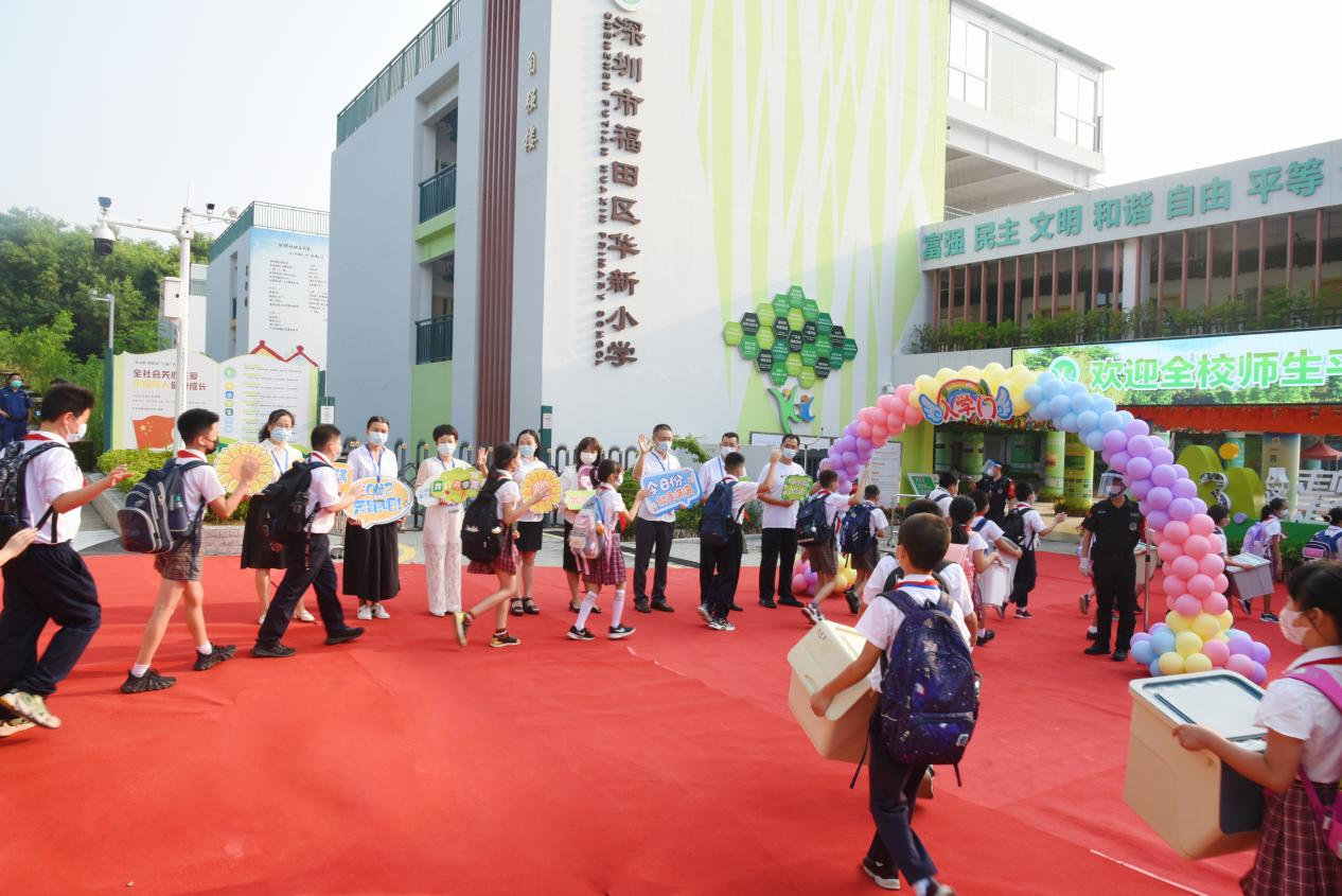 “同學(xué)們好!歡迎你們回家!”9月20日一早,華新小學(xué)校長(zhǎng)張偉帶領(lǐng)老師們、家長(zhǎng)義工們在校門(mén)口迎候四至六年級(jí)學(xué)生返校。同學(xué)們背著書(shū)包,抱著午托箱,迎著朝陽(yáng),踏著紅毯意氣風(fēng)發(fā)走進(jìn)“入學(xué)門(mén)”。校領(lǐng)導(dǎo)、老師和家長(zhǎng)義工們熱情迎接同學(xué)們平安返校,學(xué)生們從此告別漫長(zhǎng)的暑假,開(kāi)啟新學(xué)期的校園學(xué)習(xí)生活。