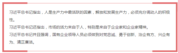 中國(guó)特色社會(huì)主義進(jìn)入新時(shí)代,建設(shè)現(xiàn)代化經(jīng)濟(jì)體系,推動(dòng)經(jīng)濟(jì)發(fā)展質(zhì)量變革、效率變革、動(dòng)力變革,需要更好發(fā)揮包括國(guó)有企業(yè)家在內(nèi)的廣大企業(yè)家的作用。去年黨中央專門印發(fā)了《關(guān)于營(yíng)造企業(yè)家健康成長(zhǎng)環(huán)境,弘揚(yáng)企業(yè)家精神、更好發(fā)揮企業(yè)家作用的意見》,極大地調(diào)動(dòng)了企業(yè)家干事創(chuàng)業(yè)的積極性。落實(shí)好中央精神,關(guān)心愛護(hù)企業(yè)家,需要各方面共同努力。
