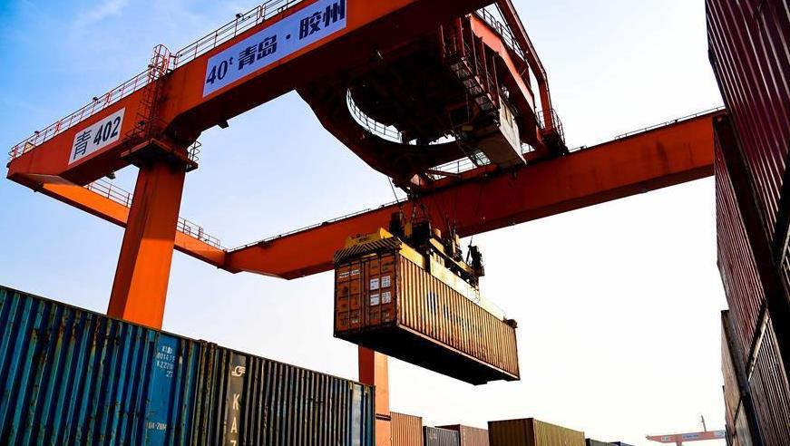 2018年5月7日,在青島膠州灣國(guó)際物流園,龍門塔吊在往中亞班列上裝載貨物。來(lái)源:新華網(wǎng)