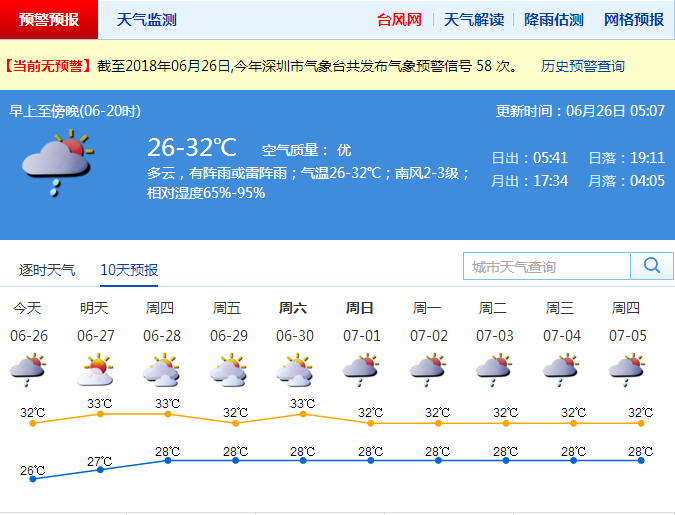 深圳新聞網(wǎng)6月26日訊(記者 何暢)昨天夜間到今天白天,深圳陰天轉(zhuǎn)多云,有陣雨和雷陣雨,最大雨量出現(xiàn)在草埔站,為44.2毫米,早晨最低氣溫在25-26℃,白天最高氣溫在30-31℃;偏南風(fēng)2-3級;相對濕度70%-95%;全市能見度普遍在10-15公里,雨時能見度有所降低。