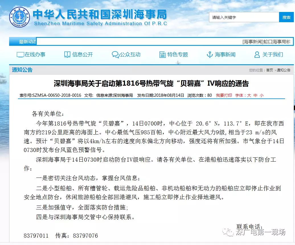 深圳海事局發(fā)布關(guān)于啟動第1816號熱帶氣旋“貝碧嘉”IV響應(yīng)的通告