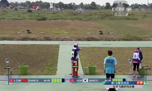 8月20日,龍崗運(yùn)動(dòng)員張?chǎng)吻飱Z得2018年雅加達(dá)亞運(yùn)會(huì)射擊賽場(chǎng)展開女子飛碟多向個(gè)人賽冠軍。(央視視頻截圖)