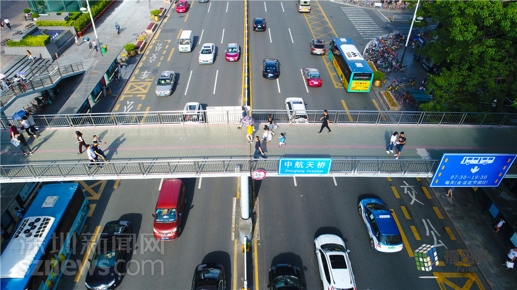 中航天橋位于深南大道上,是華強(qiáng)北過(guò)了中心公園后唯一一個(gè)比較標(biāo)志性的構(gòu)筑物