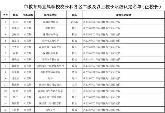 此次公示名單中,職級(jí)最高的是二級(jí)正校長(zhǎng),特級(jí)和一級(jí)正校長(zhǎng)空缺。此次公示的二級(jí)正校長(zhǎng)共157人,其中市直屬10人。各區(qū)中,二級(jí)正校長(zhǎng)最多的是福田區(qū),共有32人,龍崗和寶安緊隨其后,分別有29、27人。羅湖、南山、龍華三區(qū),則分別有19、16和13人。其他各區(qū)的二級(jí)正校長(zhǎng)均在10人以內(nèi)(大鵬新區(qū)暫無(wú))。