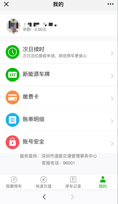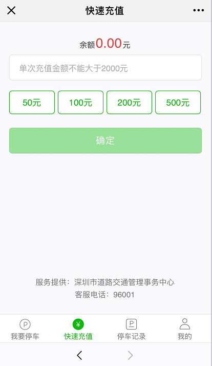 在這個(gè)界面還有“快速充值、停車記錄、我的”等導(dǎo)航入口