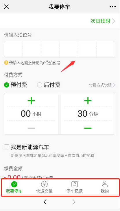 按箭頭填上泊位號,填好預(yù)付費(fèi)或后付費(fèi),選擇預(yù)停時(shí)間,點(diǎn)擊確定即可。