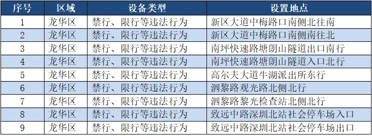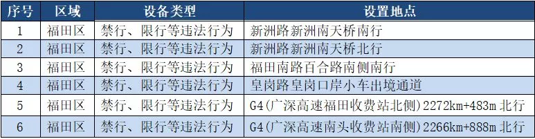 另外,重點(diǎn)整治機(jī)動車禁行、限行等多種違法行為的交通技術(shù)監(jiān)控設(shè)備,深圳交警公布啟用87套。涉及福田區(qū)、羅湖區(qū)、南山區(qū)、寶安區(qū)、龍崗區(qū)、龍華區(qū)、光明新區(qū)、坪山區(qū)、大鵬新區(qū)等9個區(qū)域。
