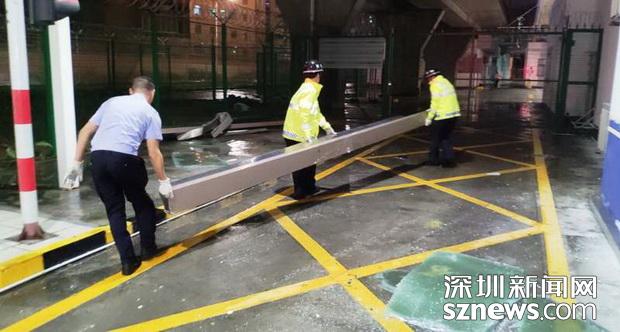 24:00,超強臺風基本過境,警戒隊的民警在皇崗口岸限定區(qū)域巡查清理、扶起被狂風吹倒的隔離設(shè)施、挪除被刮得到處都是的路標指引、查看各執(zhí)勤場地是否通行順暢,逐一將口岸恢復(fù)成往常井然有序的模樣。