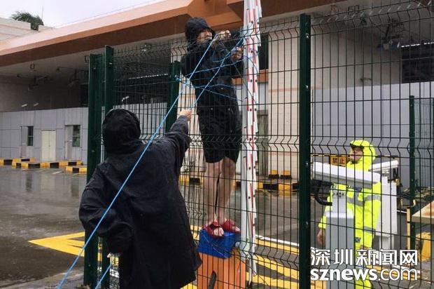邊檢技術民警冒雨在搶修被強臺風損毀的車道閘桿