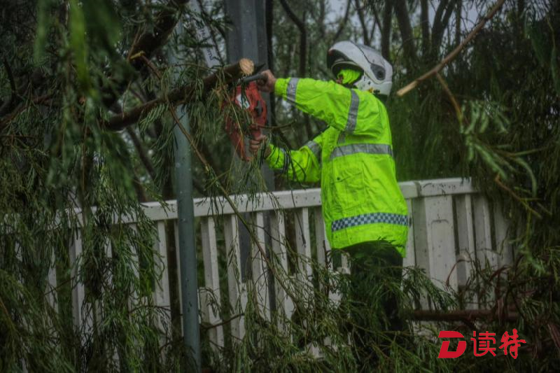 面對強(qiáng)大的臺風(fēng),艾力軍感到焦急又無奈?!罢娴氖锹穬膳缘臉湟豢每玫脑谖已矍暗瓜?疏通不完的排水口,清理不完的倒樹?!卑妼τ浾哒f。即便如此,他還是帶領(lǐng)隊員不斷的在風(fēng)雨中努力嘗試不讓路被積水、倒樹堵死,一次次下車排除險情。