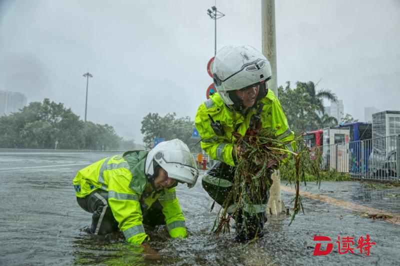 但是,眼前的情況,他們無法視而不見。深鹽二通道下方,羅沙路羅湖公安分局調(diào)頭口處,當(dāng)艾力軍經(jīng)過這里時發(fā)現(xiàn)由于地勢低洼路面已經(jīng)嚴(yán)重積水,他們馬上停下車,疏通下水道。一行人在風(fēng)雨中走進(jìn)機(jī)動車道,沿著路邊只能用手在積水中摸索排水口的位置,將阻塞入水口的樹枝樹葉掏出來。但風(fēng)急雨驟,道路積水水位剛下降一點,剛被清理的下水道又堵樹葉、樹枝等雜物堵上,他們只好不斷地進(jìn)行著重復(fù)的動作。而此時,臺風(fēng)“山竹”距離深圳接近130公里,羅湖片區(qū)測得最大陣風(fēng)達(dá)16級。