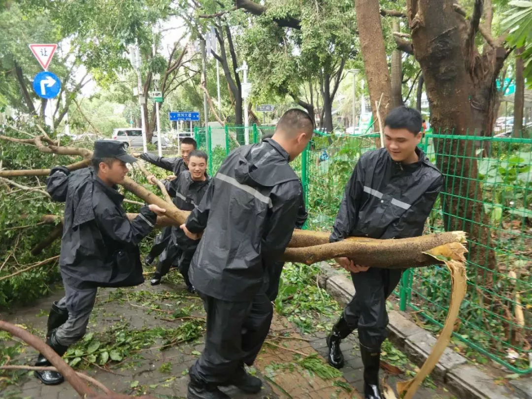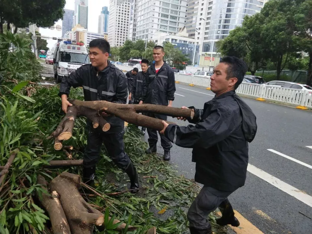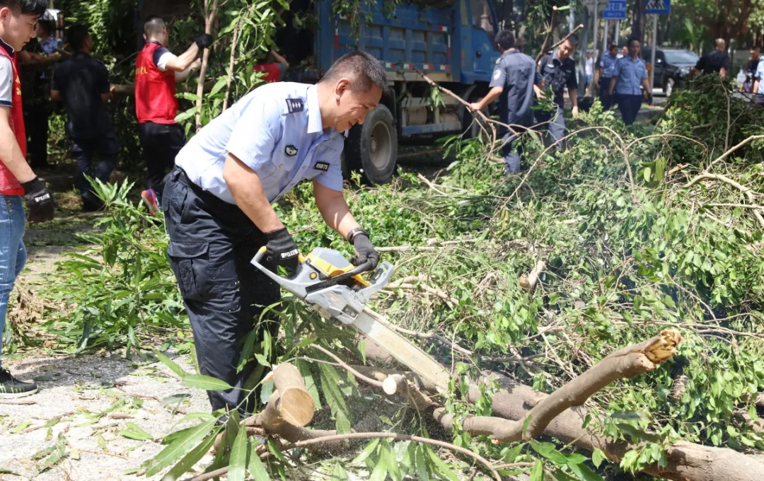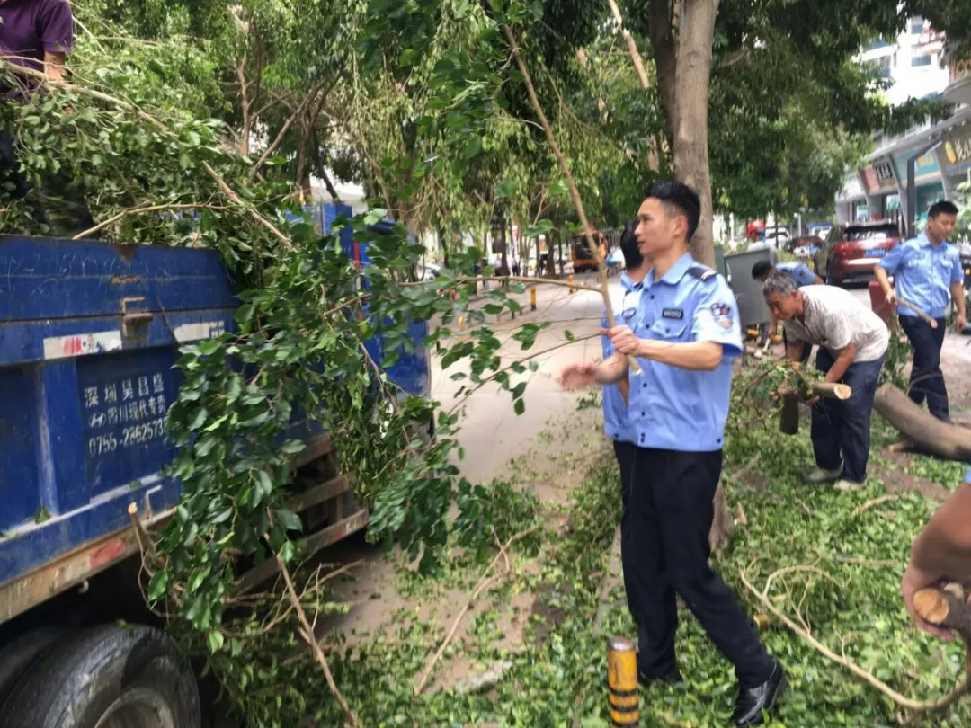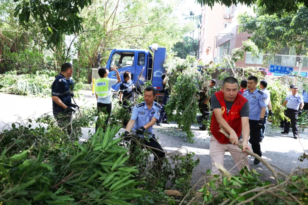 9月19日上午,福田區(qū)百花二路、三路,60多名身著藍(lán)色制服的警察和紅色馬甲的輔警格外顯眼,他們正在揮汗如雨地進(jìn)行災(zāi)后路障清理工作。