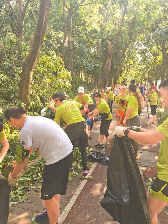 ▲深圳各跑團(tuán)跑友們自發(fā)參與各大公園的清障清掃工作。