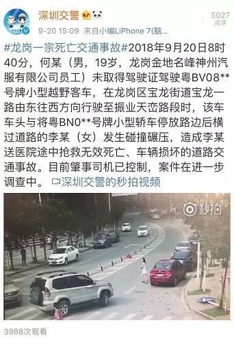 2018年9月20日8時40分,何某(男,19歲,龍崗金地名峰神州汽服有限公司員工)未取得駕駛證駕駛粵BV08**號牌小型越野客車,在龍崗區(qū)寶龍街道寶龍一路由東往西方向行駛至振業(yè)天巒路段時,該車車頭與將粵BN0**號牌小型轎車停放路邊后橫過道路的李某(女)發(fā)生碰撞碾壓,造成李某送醫(yī)院途中搶救無效死亡、車輛損壞的道路交通事故。目前肇事司機已控制,案件在進一步調查中。